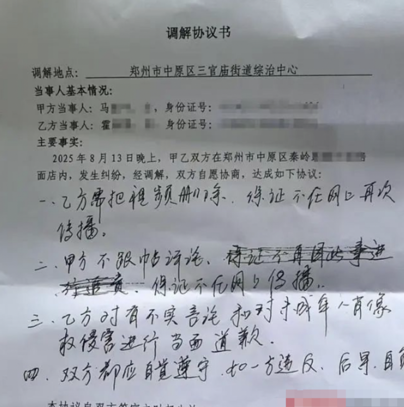 8月15日,雙方在鄭州中原區(qū)三官?gòu)R街道辦的調(diào)解下,達(dá)成和解協(xié)議。受訪者供圖
