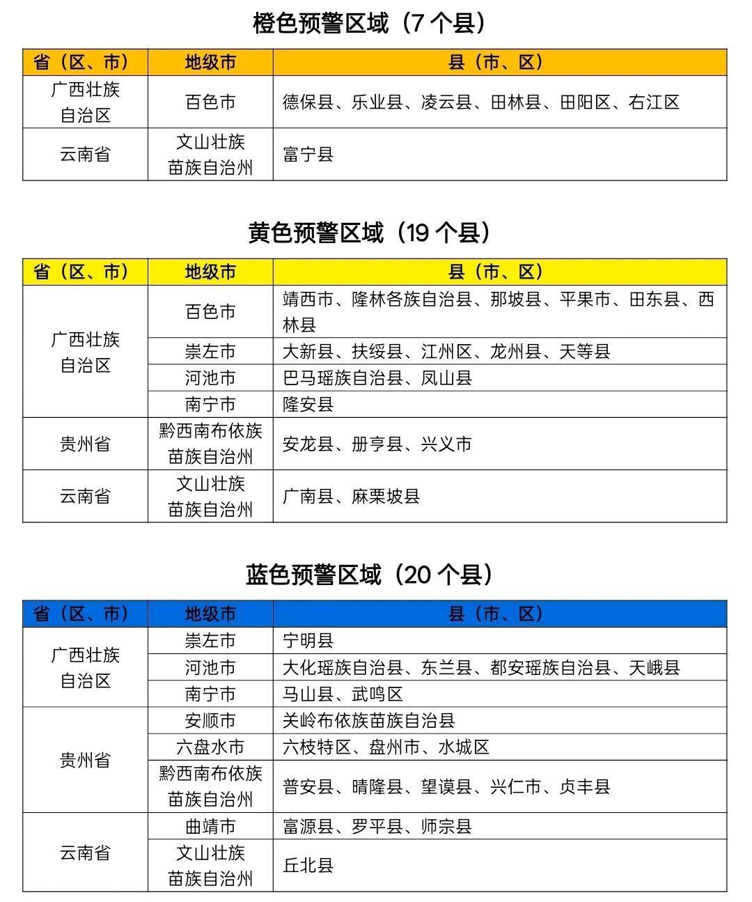 其他地區(qū)也可能因局地短歷時強降水引發(fā)山洪災害,請各地注意做好實時監(jiān)測、橙色防汛預警和轉(zhuǎn)移避險等防范工作。預警云南預警區(qū)域涉及的廣西縣(市、區(qū))如下: