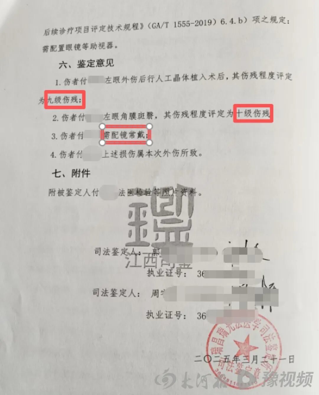 魏女士稱,經(jīng)過(guò)兩次手術(shù),經(jīng)歷了約4個(gè)月的治療后,于2025年3月5日回家進(jìn)行康復(fù)訓(xùn)練。目前傷殘等級(jí)被評(píng)定為9級(jí)與10級(jí)共存,孩子左眼植入人工晶體,看近處必須佩戴特殊眼鏡,否則看不見(jiàn)近處事物。