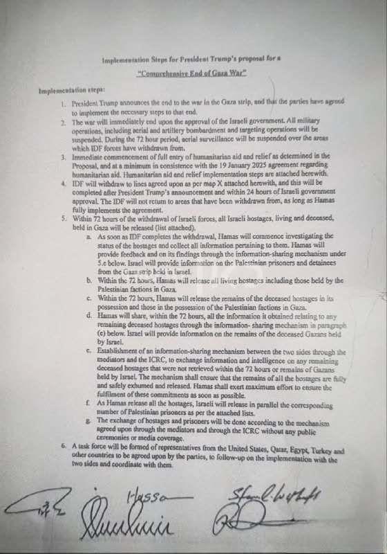當(dāng)?shù)貢r間9日夜間,以色列公共廣播公司Kan發(fā)布了以色列、火協(xié)后哈馬斯和調(diào)解員在埃及簽署的議文有人釋放被扣押人員和結(jié)束加沙沖突的協(xié)議副本。這份文件詳細(xì)介紹了該協(xié)議的撤軍各個部分。