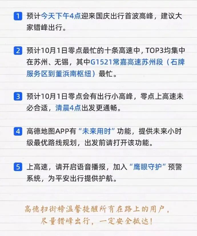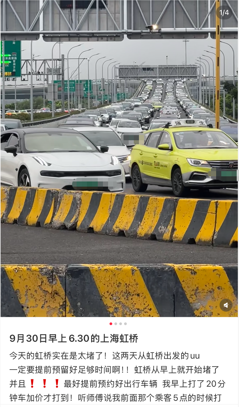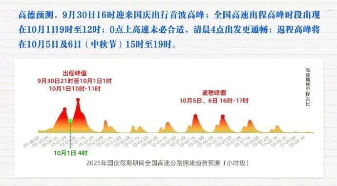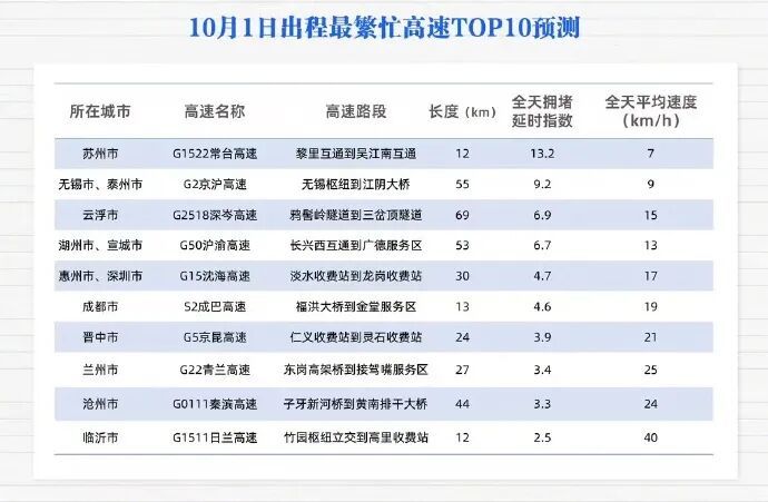 另據(jù)市公安交管部門研判,9月30日午后,10月1日和2日每日10時至11時,全市高速公路將迎來出城車流高峰;車流返程高峰預計出現(xiàn)在10月7日和8日每日15時后。上述時段內,G40長江隧橋、G2武寧路地道出城段、S32松江段、G50青浦城區(qū)段、G60大蒸港橋段等路段,及G40高東、G50徐涇、G60新橋、G2江橋等高速收費站,都將面臨大流量考驗。