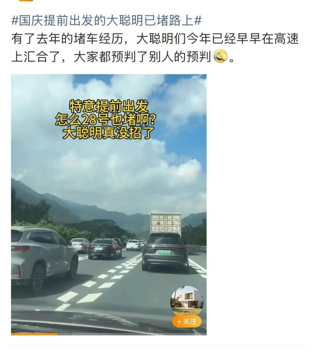 簡介今天是國慶前的最后一個工作日你們今天幾點下班?有人已經(jīng)拼好假“請3休12”早早出發(fā)了昨天9月29日)“聰明的人已經(jīng)提前出發(fā)了”話題沖上熱搜然而“國慶提前出發(fā)的大聰明已堵路上”今天就登上了微博熱搜網(wǎng)友笑