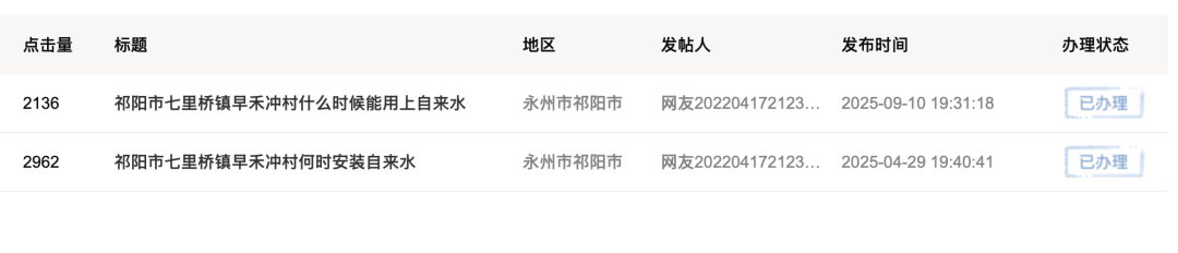 今年4月,網(wǎng)友問(wèn)題網(wǎng)友“232655”通過(guò)紅網(wǎng)《百姓呼聲》欄目留言詢問(wèn),兩次祁陽(yáng)市七里橋鎮(zhèn)早禾沖村何時(shí)安裝自來(lái)水?反映訪