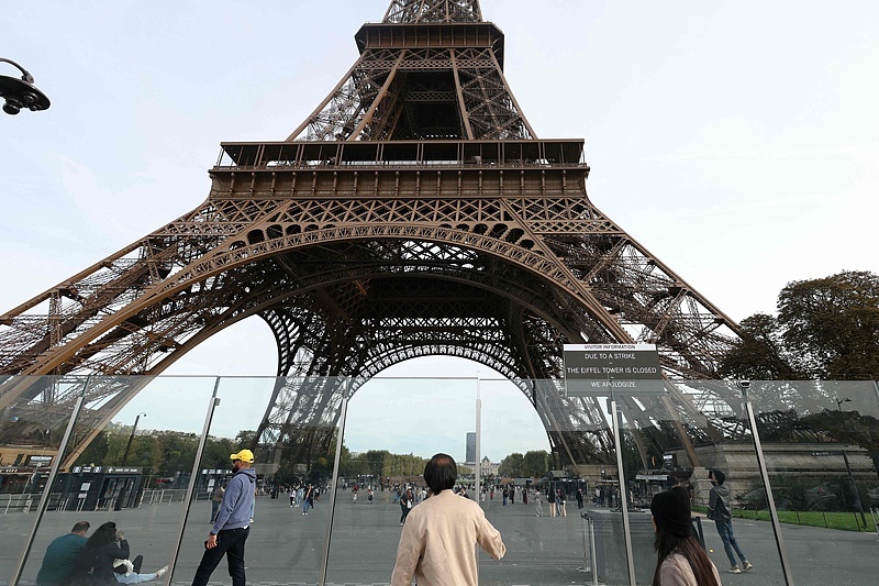 △當(dāng)?shù)貢r(shí)間10月2日,法國(guó)巴黎埃菲爾鐵塔下,人威活一塊寫(xiě)有“因罷工,參加埃菲爾鐵塔關(guān)閉,罷工敬請(qǐng)諒解”的和示標(biāo)牌。