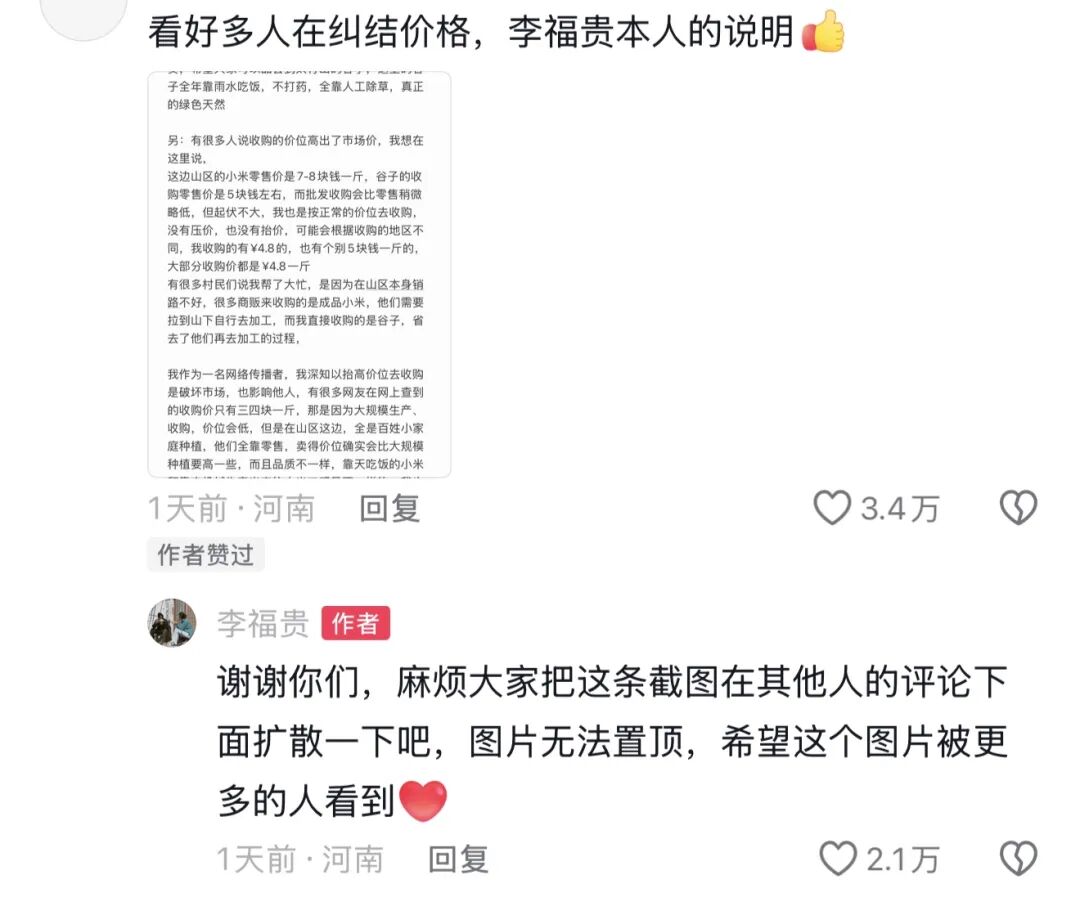而針對(duì)網(wǎng)友的質(zhì)疑和厚愛(ài),李福貴也及時(shí)發(fā)表了聲明,以表明自己并非高價(jià)收購(gòu)“破壞市場(chǎng)”的行為。