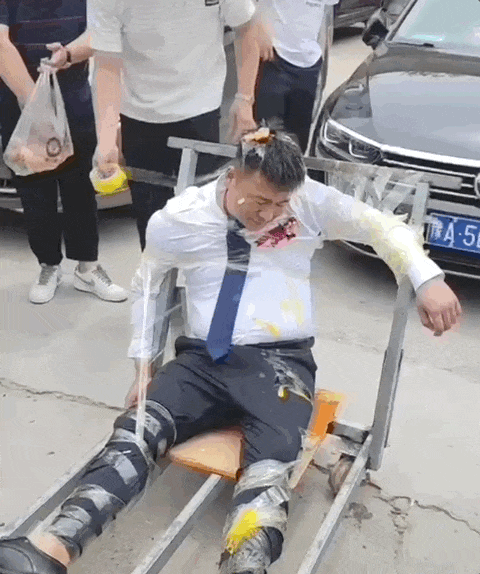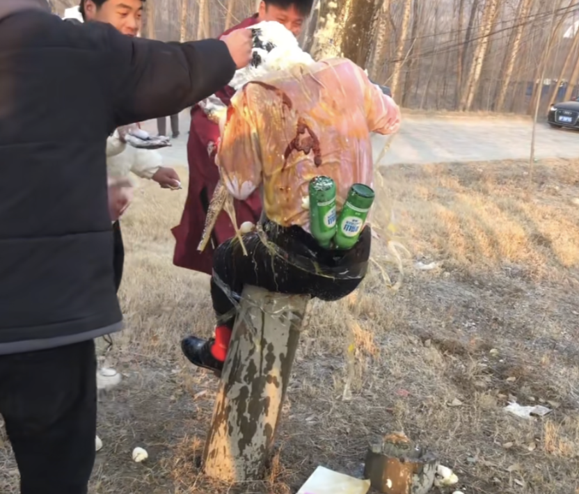 有人扛來一袋雞蛋,挨個砸在新郎頭上,雞蛋碎裂,蛋液順著西裝往下淌,然而被綁得動彈不得,只能忍受。