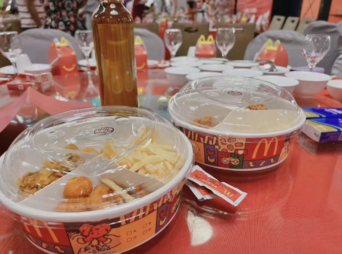 現(xiàn)在的年輕人,卻把西式婚禮辦進了麥當勞,來賓人手一份漢堡薯條。反正酒店的婚宴也多是預制菜,那就不必裝了。