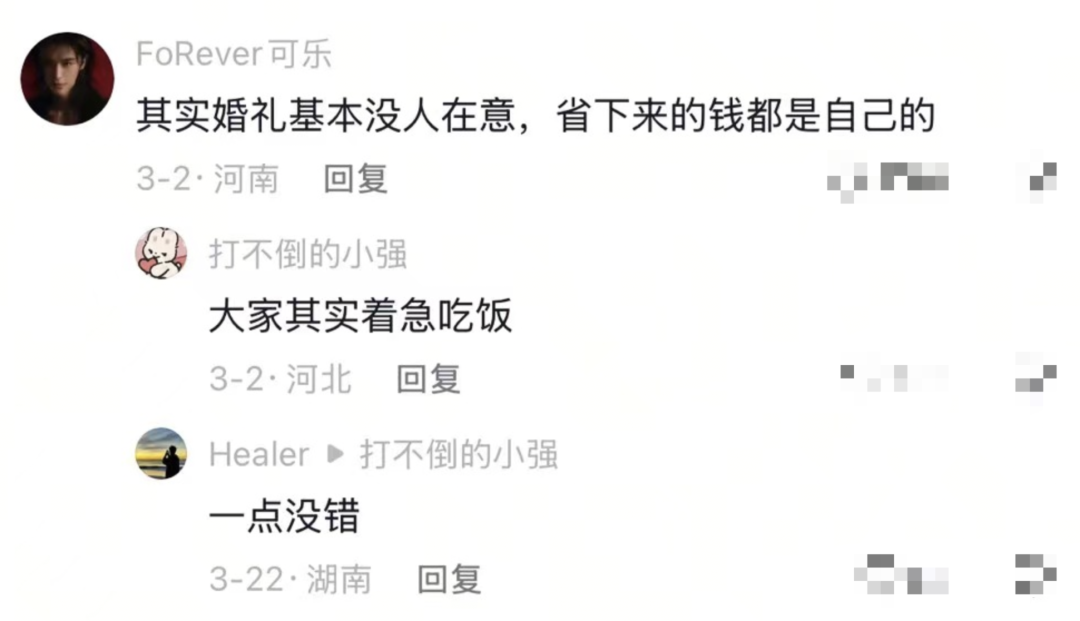 有網(wǎng)友的回復一針見血:“說實話,參加婚禮的人,很少在意你的儀式流程,也沒人在乎你在臺上哭沒哭。大家真正關(guān)心的只有兩件事——幾點開席,以及今天的席好不好吃?!?/p>