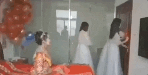 接親環(huán)節(jié),伴娘們通常是守門的角色,有人一腳踢開房門,門撞擊在伴娘頭上,把人掀翻在地。