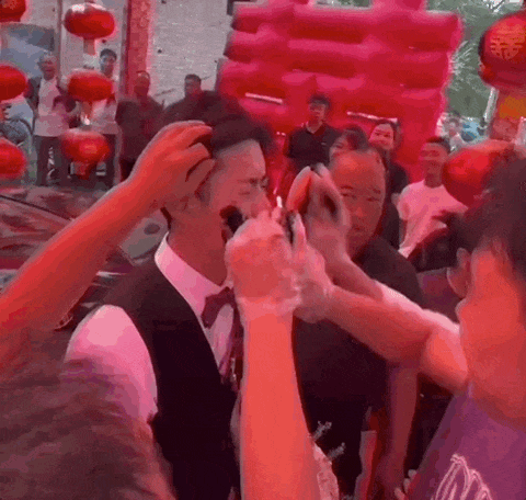 有人讓新郎蹲在坑里,一盆一盆的醬油、飲料往身上潑。