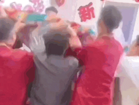 結(jié)婚當天,新郎是兄弟們的“出氣筒”,雙手被木棍反綁,渾身噴滿彩帶,狼狽不堪。