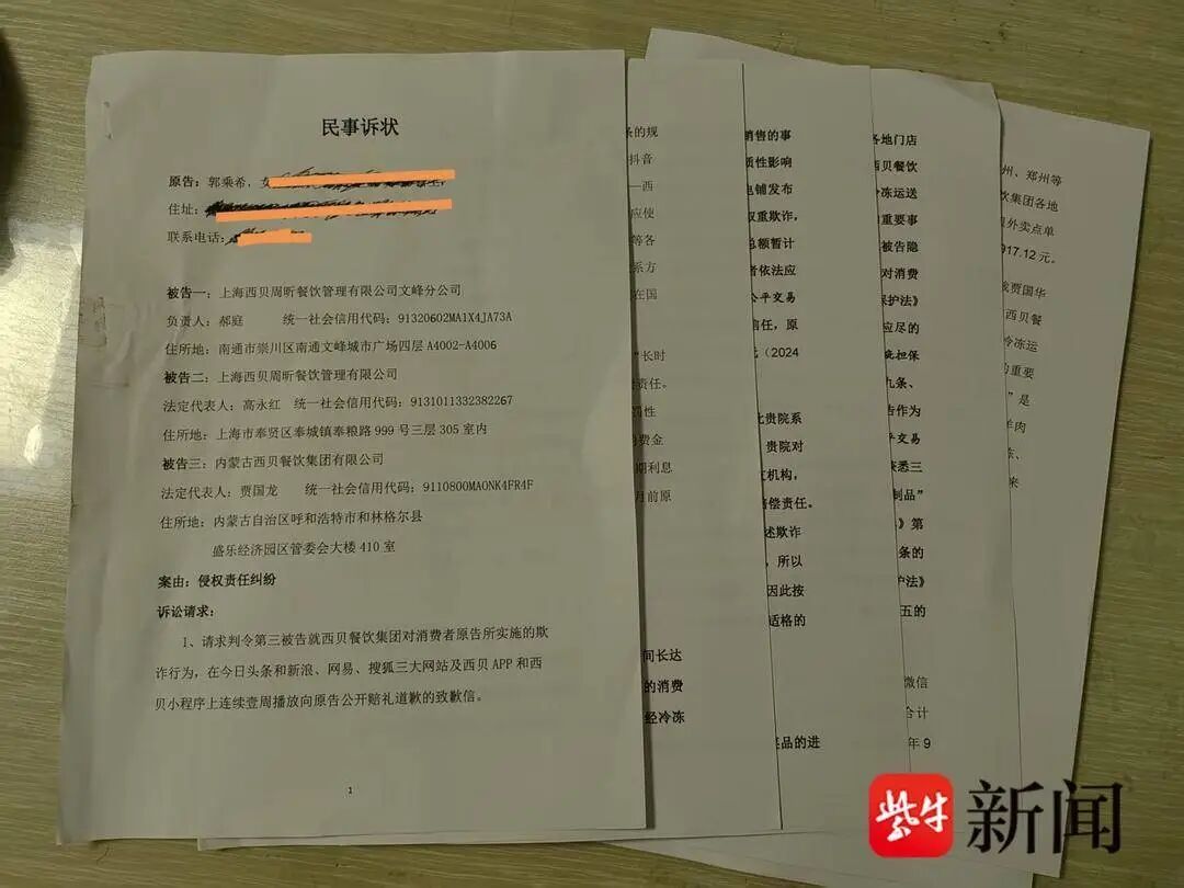 郭乘希本身就是律師一名律師,9月26日,起訴她以 “侵權(quán)責(zé)任糾紛” 為由,西貝虛假宣傳將上海西貝周昕餐飲管理有限公司文峰分公司、年老上海西貝周昕餐飲管理有限公司、顧客內(nèi)蒙古西貝餐飲集團(tuán)有限公司訴至崇川區(qū)人民法院,索賠主張三被告存在虛假宣傳、并求侵害消費(fèi)者知情權(quán)等行為,道歉相關(guān)訴訟材料及證據(jù)已正式提交。律師