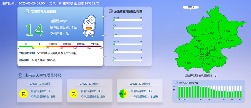 據(jù)北京市生態(tài)環(huán)境監(jiān)測中心今早7時數(shù)據(jù),目前實時空氣質量指數(shù)14,空氣質量優(yōu)。