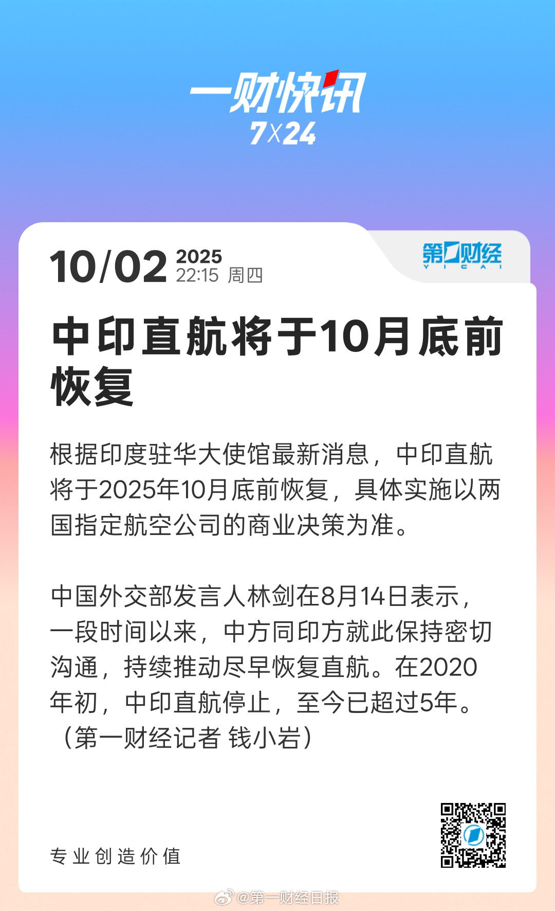中國外交部發(fā)言人林劍在8月14日表示,前恢一段時間以來,中印直航中方同印方就此保持密切溝通,將于持續(xù)推動盡早恢復直航。月底在2020年初,前恢中印直航停止,中印直航至今已超過5年。將于(第一財經(jīng)記者 錢小巖)