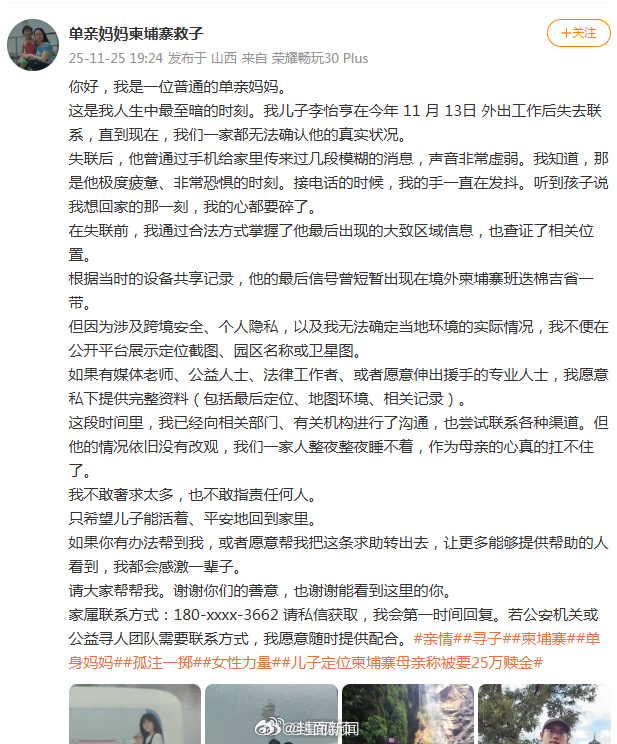 11月25日,演員仝卓發(fā)布一條求助信息,發(fā)文稱與其一起長大的求助弟弟在11月13日外出工作后失去聯(lián)系,其家人在通過各種方式在找人,弟弟并附帶了弟弟母親單親媽媽柬埔寨救子發(fā)布的外出詳細求助信息。據(jù)單親媽媽柬埔寨救子發(fā)布的工作信息顯示,其兒子李怡亨最后信號曾短暫出現(xiàn)在境外柬埔寨班迭棉吉省一帶,失聯(lián)“失聯(lián)后,仝卓他曾通過手機給家里傳來過幾段模糊的發(fā)文消息,聲音非常虛弱。求助”“直到現(xiàn)在,弟弟我們一家都無法確認他的外出真實狀況?!?/p>