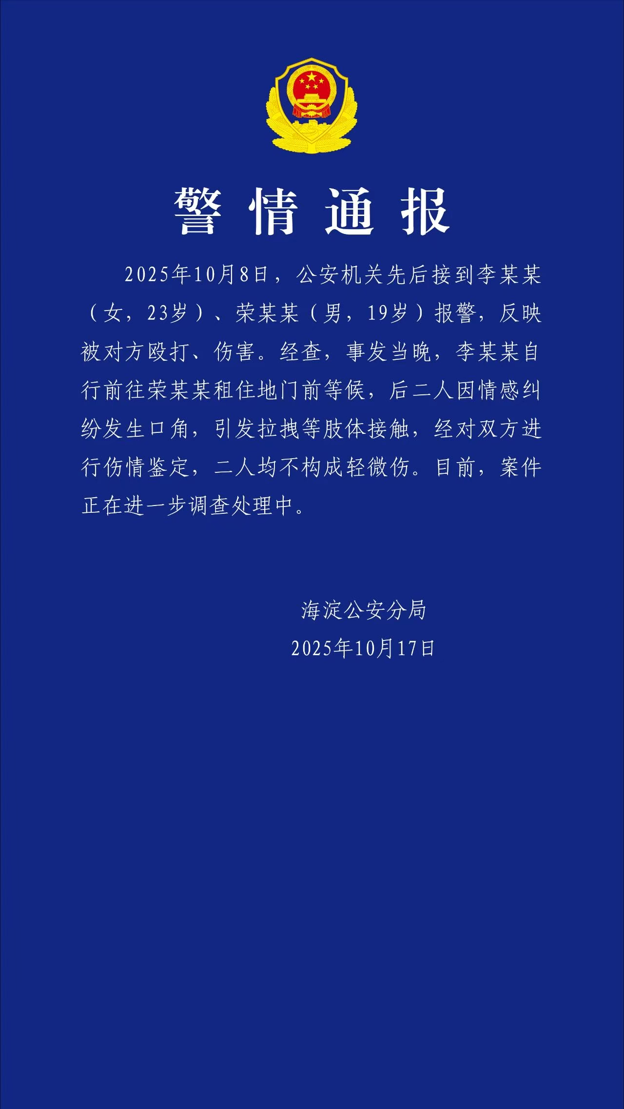 簡介自動(dòng)播放針對近日李某某、榮某某引發(fā)網(wǎng)絡(luò)熱點(diǎn)事件,北京海淀公安今日發(fā)布警情通報(bào)。總臺記者 許夢哲 趙學(xué)榮) ...