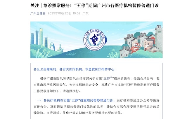 當(dāng)前,廣州一些醫(yī)院也在陸續(xù)發(fā)布就診安排通知,如廣州醫(yī)科大學(xué)附屬市八醫(yī)院稱9月24日(星期三)全部門(mén)診、體檢服務(wù)暫停1天,急診24小時(shí)正常接診,為急危重癥患者提供服務(wù)。再如廣州市第一人民醫(yī)院也通知稱院本部、南沙醫(yī)院、鶴洞分院將于9月24日全天暫停門(mén)診服務(wù)(含體檢、檢驗(yàn)檢查);急診24小時(shí)正常接診,全力保障急危重癥患者的救治。