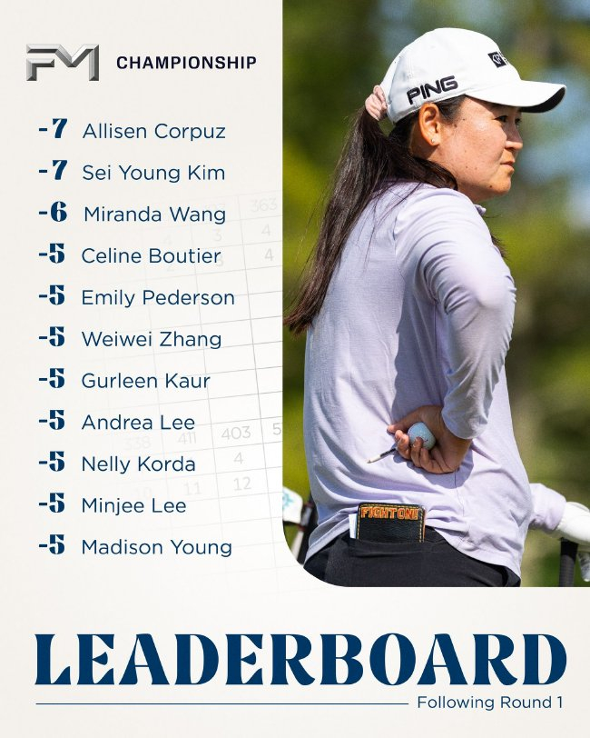 北京時間8月29日,美國選手艾莉森-科潑斯(Allisen Corpuz)在今年大部分時間進展緩慢的賽金世煐情況下始終保持耐心,終于在周四的并列FM錦標賽首輪迎來突破。她交出65桿,領(lǐng)先低于標準桿7桿,王馨維與金世煐(Kim Sei Young)、迎第朱迪-夏多夫(Jodi Ewart Shadoff)并列領(lǐng)先。錦標