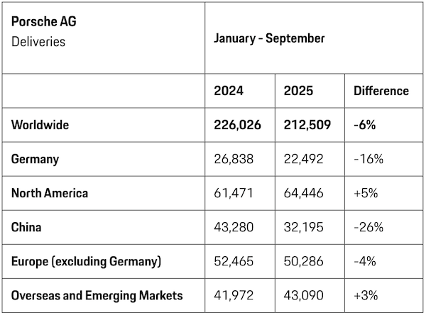 銷量方面,今年前三季度,保時(shí)捷中國和歐洲市場出現(xiàn)了同比下滑,其中,中國市場銷量下跌幅度最大,同比下滑26%至3.2萬輛,德國市場銷量同比下滑16%至2.25萬輛,整個(gè)歐洲市場(除德國外)同比下跌4%至5萬輛。這些主要市場的銷量下滑,也讓保時(shí)捷在今年前三季度銷量整體下滑了6%至21.25萬輛。