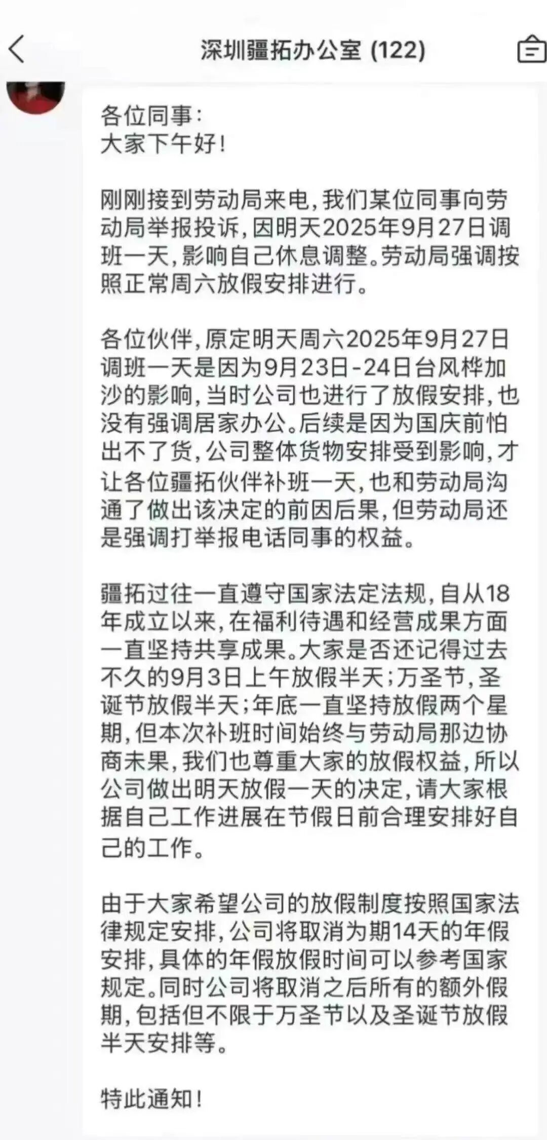 廣東深圳一公司因臺風(fēng)放假耽誤了工期,公司要求員工在9月27日(周六)補班一天,補班結(jié)果被員工投訴至勞動部門。遭投最新當(dāng)天該公司發(fā)布通知,訴反手滿足員工要求,消天27日不調(diào)班,年假但將調(diào)整公司放假制度,福利取消員工14天年假福利及所有額外假期。公司此事引發(fā)網(wǎng)友廣泛關(guān)注。補班