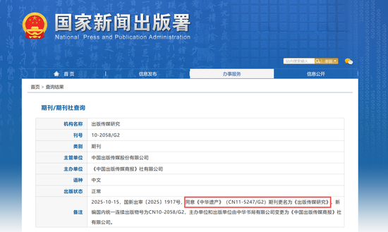 國家新聞出版署網(wǎng)站顯示,輯部《中華遺產(chǎn)》(CN11-5247/G2)期刊已更名為《出版?zhèn)髅窖芯俊?,無任望新編國內(nèi)統(tǒng)一連續(xù)出版物號為CN10-2058/G2,何復(fù)主辦單位和出版單位由中華書局有限公司變更為《中國出版?zhèn)髅缴虉蟆飞缬邢薰????/p>