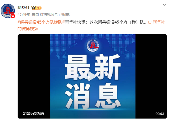 新華社快訊:這次閱兵編設(shè)45個方(梯)隊。閱兵