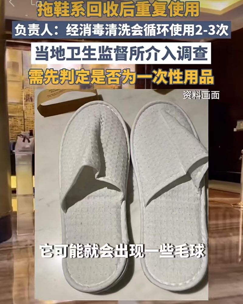 ▲涉事酒店承認(rèn),出于環(huán)??裳h(huán)考量該類拖鞋會(huì)回收消毒后復(fù)用。圖/封面新聞視頻截圖據(jù)上游新聞報(bào)道,9月21日,有住客在網(wǎng)上反映江蘇常州萬(wàn)豪酒店循環(huán)使用一次性拖鞋,肉眼可見拖鞋已經(jīng)起球還粘著睫毛。對(duì)此,涉2025-11-30