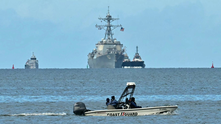 10月26日,美軍導(dǎo)彈驅(qū)逐艦“格雷夫利”號(上中)在特立尼達和多巴哥首都西班牙港附近海域航行。大兵 新華社發(fā)