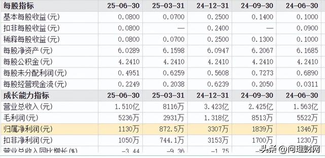 根據(jù)半年報顯示,2025年上半年公司實現(xiàn)營收1.51億元,同比下降3.44%,實現(xiàn)凈利潤為1130萬元,同比下降16.08%,扣非凈利潤為1050萬元……