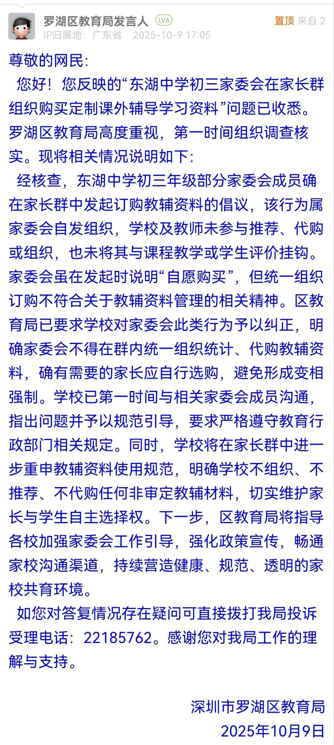 學校已第一時間與相關家委會成員溝通,織買指出問題并予以規(guī)范引導,要求嚴格遵守教育行政部門相關規(guī)定。同時,學校將在家長群中進一步重申教輔資料使用規(guī)范,明確學校不組織、不推薦、不代購任何非審定教輔材料,切實維護家長與學生自主選擇權。