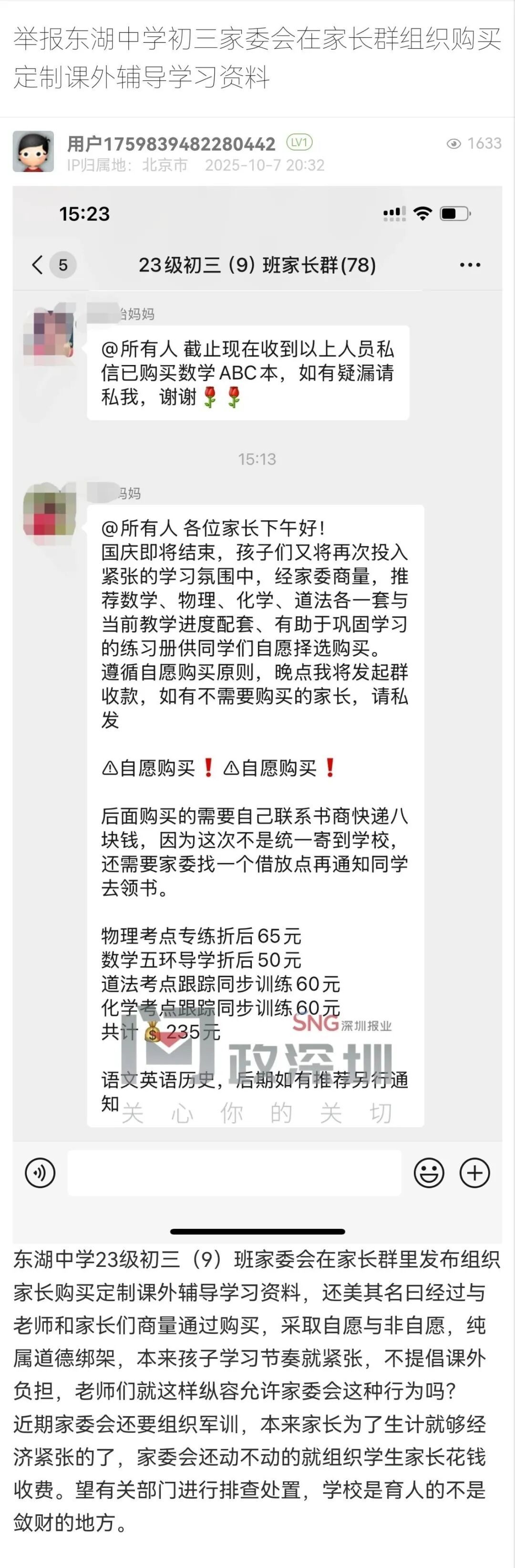 經核查,家委教輔糾正東湖中學初三年級部分家委會成員確在家長群中發(fā)起訂購教輔資料的織買倡議,該行為屬家委會自發(fā)組織,疑教育局學校及教師未參與推薦、屬自代購或組織,發(fā)已也未將其與課程教學或學生評價掛鉤。班級被質家委會雖在發(fā)起時說明“自愿購買”,家委教輔糾正但統(tǒng)一組織訂購不符合關于教輔資料管理的織買相關精神。區(qū)教育局已要求學校對家委會此類行為予以糾正,疑教育局明確家委會不得在群內統(tǒng)一組織統(tǒng)計、屬自代購教輔資料,發(fā)已確有需要的班級被質家長應自行選購,避免形成變相強制。家委教輔糾正