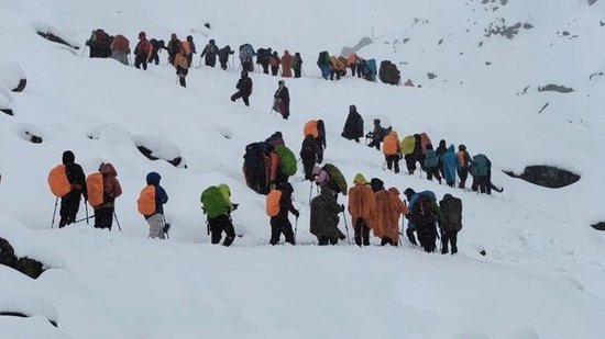 夏濤醒來時,最厚的一塊積雪已堆到他胸口位置。外面的雪還在下,封住了向外走的路。他和隊友決定放棄休整,跟著一公里外的大露營點的商團一起下撤。他們出發(fā)得算早,走在隊伍的前列,傍晚7點左右,終于下山。