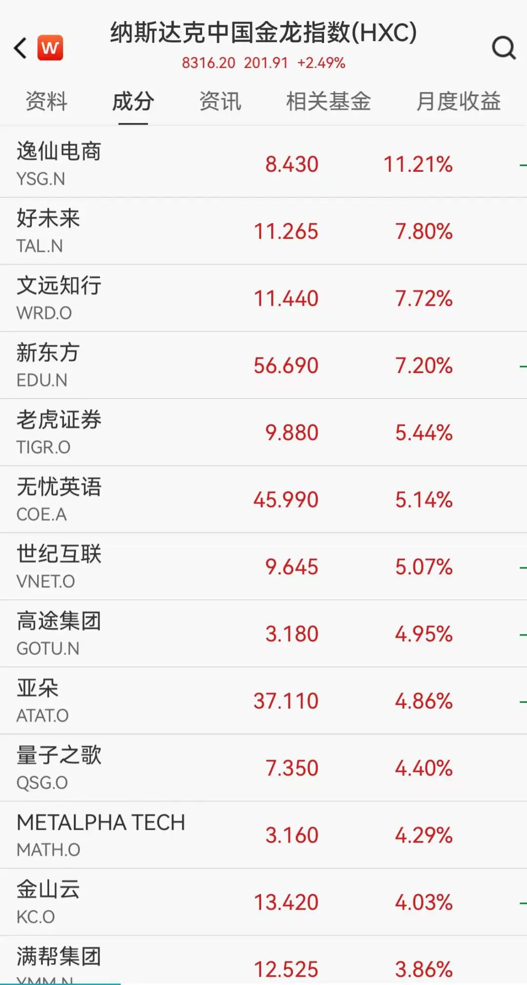 納斯達(dá)克中國金龍指數(shù)漲逾2%,新東方、文遠(yuǎn)知行等大漲超7%,中概股科技龍頭集體上漲,阿里、京東、百度漲超2%。