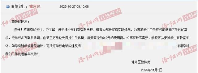 涉事學(xué)校是瀍河區(qū)君河灣小學(xué),是將處一所公辦小學(xué)。對(duì)此,理責(zé)11月24日,瀍河區(qū)教體局回復(fù):該校聯(lián)合愛(ài)心企業(yè)推出成本價(jià)午休設(shè)施,經(jīng)家委會(huì)商議達(dá)成共識(shí)后,為午托學(xué)生配置午休椅,收費(fèi)按天計(jì)算,期末結(jié)算。