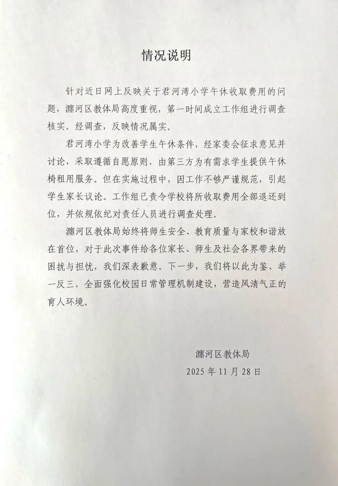 小學(xué)收“午休費(fèi)”?當(dāng)?shù)亟腆w局:將處理責(zé)任人
