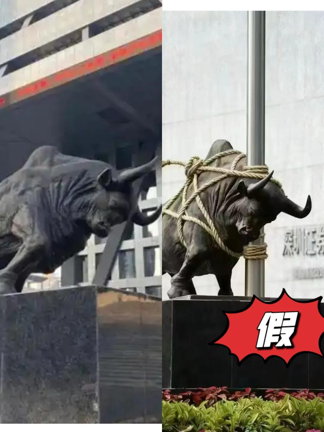 同日,有網(wǎng)民傳播的圖片顯示,深交所門前的牛雕塑被用繩拴在一根柱子上。經(jīng)觀察發(fā)現(xiàn),深交所的牛雕塑旁邊并沒有柱子,其背后也沒有深交所的門牌字,相關(guān)圖片疑似為AI工具制作的。