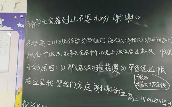 據(jù)九派新聞報(bào)道,境少因想要幫媽媽掙醫(yī)藥費(fèi)和幫爸爸還賬,年都安徽淮南第五中學(xué)一高中生公開在學(xué)校黑板留言,被溫請(qǐng)求學(xué)長(zhǎng)學(xué)姐留下空瓶子,請(qǐng)求用收廢瓶的學(xué)長(zhǎng)學(xué)姐方式幫家里解決問題。目前,留瓶該校每個(gè)班級(jí)都已為該生專門設(shè)立了存放廢瓶的讓每柔待容器,或是個(gè)困盒子或是桶,方便其集中收集。境少該生會(huì)在放學(xué)時(shí)段前往各班級(jí)取走廢瓶。年都