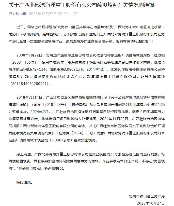 新聞眼10月27日,北海市鐵山港區(qū)海洋局發(fā)布情況通報,全文如下:近日,網(wǎng)絡(luò)上出現(xiàn)標(biāo)題為“北海鐵山港區(qū)排墩存在海霸填?!奔啊皬V西北海市鐵山港區(qū)有挖砂船占用港口采砂”的視頻,經(jīng)調(diào)查核實,該視頻拍攝的作業(yè)場