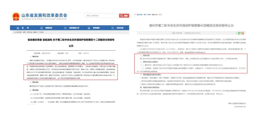白鹿新聞注意到,不知出于何種原因,山東省發(fā)改委并未在該通報中點名涉及“關(guān)停造假”的德州市相關(guān)機(jī)組。但從此前德州市發(fā)改委公布的《德州市第二輪中央生態(tài)環(huán)境保護(hù)督察第42項整改任務(wù)的銷號公示》中,還是找到了這家被中央生態(tài)環(huán)境保護(hù)督察組點名批評的電廠。