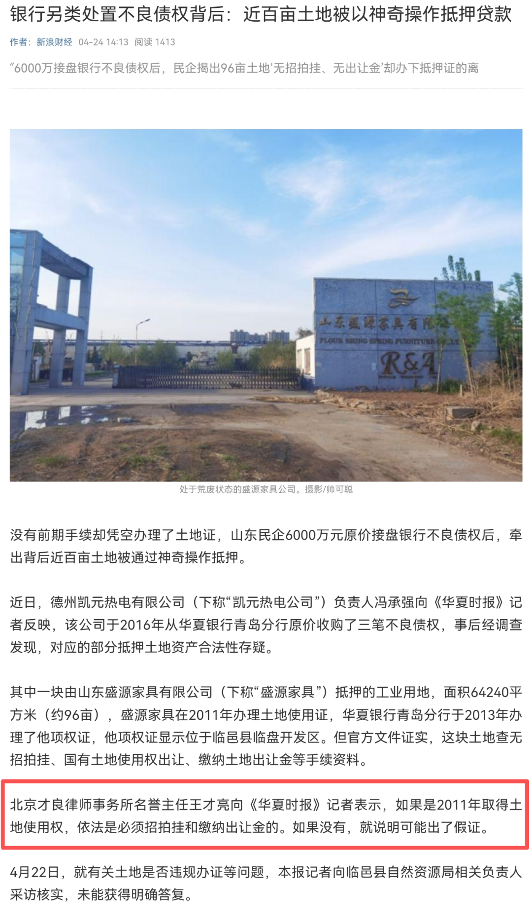 白鹿新聞援引北京航空航天大學(xué)法學(xué)院兼職教授、中國建設(shè)管理與房地產(chǎn)法研究中心執(zhí)行主任王才亮接受華夏時報采訪表示,“如果是2011年取得土地使用權(quán),依法是必須招拍掛和繳納出讓金的。如果沒有,就說明可能出了假證?!?/p>