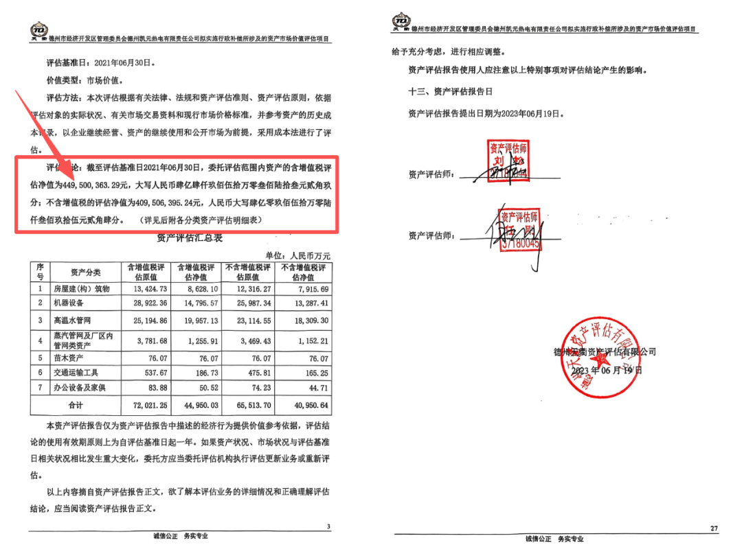 但德州經(jīng)開區(qū)管委會并不認(rèn)可這個補(bǔ)償金額,提出了雙方共同選定一家評估機(jī)構(gòu)重新評估。2023年6月19日,德州天衢資產(chǎn)評估有限公司接受雙方委托,對凱元熱電所持有的房屋建筑物、機(jī)器設(shè)備、高溫水管網(wǎng)、蒸汽管網(wǎng)、苗木、交通辦公設(shè)備等資產(chǎn)進(jìn)行市場價值評估,結(jié)果顯示總補(bǔ)償費為4.495億余元(含增值稅,如下圖)。據(jù)了解,應(yīng)凱元熱電要求,該評估報告未將凱元熱電土地使用權(quán)列入補(bǔ)償范圍。