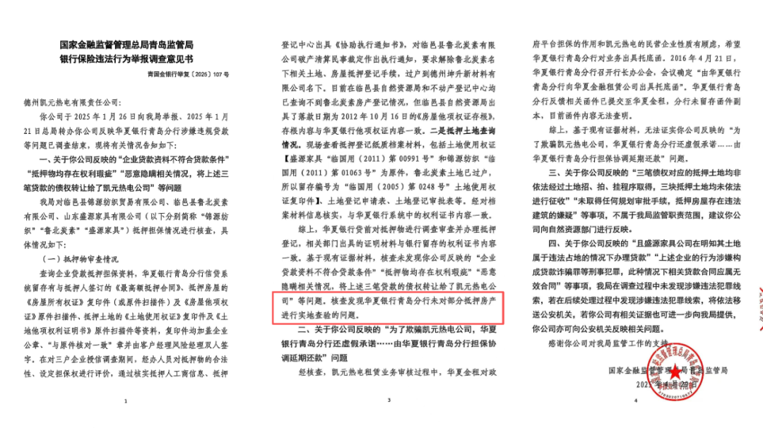 此事經(jīng)媒體曝光后,備受各方關(guān)注。2025年4月29日,國家金融監(jiān)督管理總局青島監(jiān)管局就相關(guān)舉報問題向凱元熱電作出了書面《調(diào)查意見書》,經(jīng)核查發(fā)現(xiàn)華夏銀行青島分行未對部分抵押房產(chǎn)進(jìn)行實地查驗的問題(如下圖),其中該行在對魯北炭素的授信過程中,未對部分抵押房產(chǎn)進(jìn)行實地查驗(涉及3處房屋,所有權(quán)證號分別為“魯臨房權(quán)證城字第 37281號”“魯臨房權(quán)證城字第 37282號”“魯臨房權(quán)證城字第 37278號”)。
