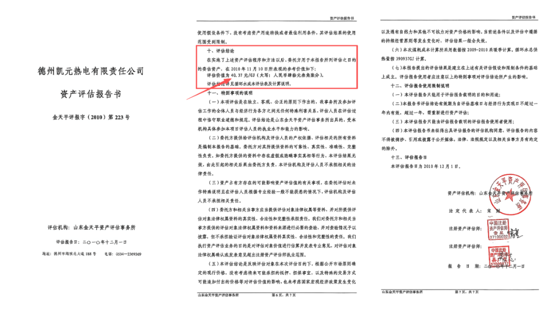 值得一提的是,在大強(qiáng)集團(tuán)洽談重組凱元熱電之際,當(dāng)?shù)卣鴮υ瓌P元熱電的供熱成本作了一次評估。據(jù)山東金天平資產(chǎn)評估事務(wù)所2010年12月1日出具的《凱元熱電資產(chǎn)評估報告書》顯示,2010年采暖季,凱元熱電循環(huán)水供熱單位成本為40.37元/吉焦(如下圖)。這意味著凱元熱電每給外包公司恒源熱力供熱一吉焦至少虧損20元。