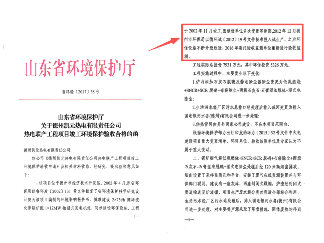 大強(qiáng)集團(tuán)接管凱元熱電后,還發(fā)現(xiàn)電廠的環(huán)評驗收及機(jī)組建設(shè)批復(fù)等手續(xù)不齊全。據(jù)原山東省環(huán)境保護(hù)廳2017年3月22日出具的《關(guān)于凱元熱電公司熱電聯(lián)產(chǎn)工程項目環(huán)境保護(hù)驗收合格函》顯示,凱元熱電于2002年11月竣工,因建設(shè)單位多次變更等原因,2012年12月德州市環(huán)保局才批準(zhǔn)投入試生產(chǎn)(如下圖)。這表明,凱元熱電在重組前的十年里,一直未經(jīng)環(huán)保部門驗收批準(zhǔn)就發(fā)電供熱,屬于“未批先建先產(chǎn)”項目。