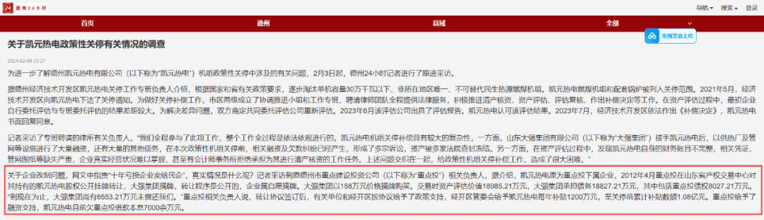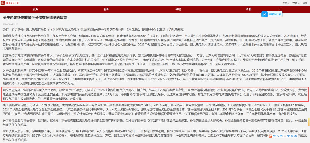 德州重投公司上述負(fù)責(zé)人曾就“政府未兌現(xiàn)凱元熱電‘直供電’問題”接受“德州24小時”記者采訪時表示,轉(zhuǎn)讓前,凱元熱電確實有過“直購電”情況,但由于不符合國家政策,“直購電”被叫停。轉(zhuǎn)讓后相關(guān)部門雖積極協(xié)調(diào)推進(jìn),但由于政策一直未調(diào)整,未能實現(xiàn)(如下圖)。