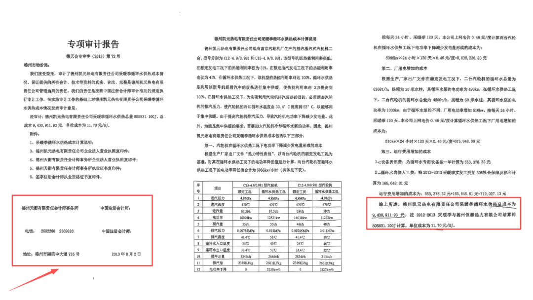 于是,德州市物價局當(dāng)即委托德州天衢有限責(zé)任會計師事務(wù)所對凱元熱電的有關(guān)情況進(jìn)行審計。據(jù)該事務(wù)所2013年8月2日出具的《凱元熱電專項審計報告》顯示,經(jīng)審計,“凱元熱電采暖循環(huán)水供熱總成本為9430911.93元,按2012-2013采暖季與恒源熱力結(jié)算的805831.10吉焦計算,供熱單位成本為11.7元/吉焦(如下圖右紅框)?!?/p>