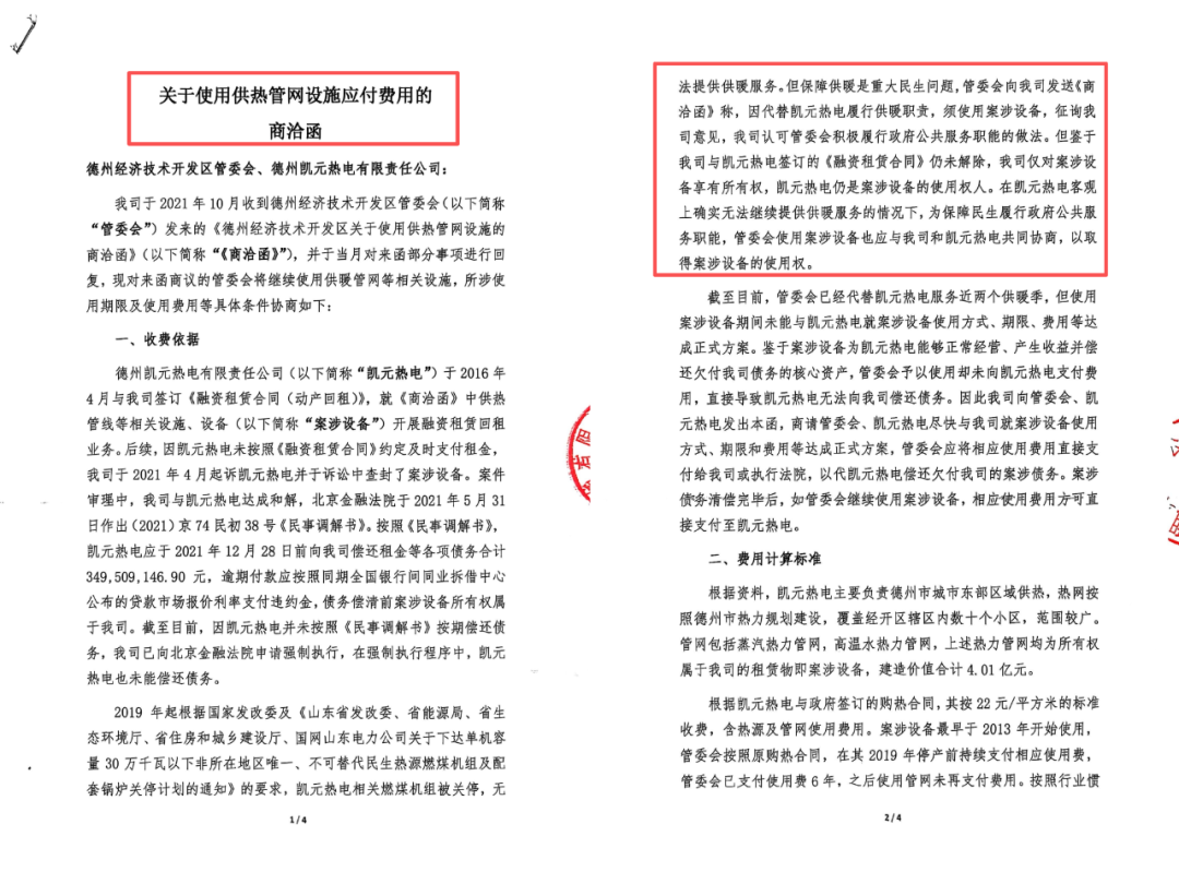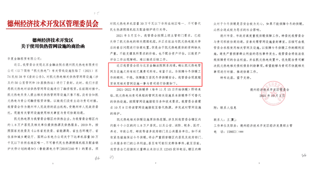 德州經(jīng)開區(qū)凱元熱電關(guān)停工作專班負(fù)責(zé)人曾就此回應(yīng)當(dāng)?shù)孛襟w,凱元熱電的供熱管網(wǎng)是區(qū)管委會從上述華夏金租手中租用過來的,因為其管網(wǎng)經(jīng)營權(quán)歸華夏金租所有。據(jù)經(jīng)開區(qū)管委會2021年10月3日給華夏金租出具的《關(guān)于使用供熱管網(wǎng)設(shè)施的商洽函》顯示,近日我管委會經(jīng)與北京金融法院聯(lián)系溝通,確認(rèn)凱元熱電管網(wǎng)及設(shè)施之所有權(quán)已屬貴司所有,現(xiàn)就租賃相關(guān)管網(wǎng)設(shè)施一事與貴公司協(xié)商承租凱元熱電供熱管網(wǎng)及設(shè)施接駁至替代熱源,以保障全區(qū)數(shù)十個小區(qū)約1.8萬戶居民今冬供暖安全,避免嚴(yán)重?fù)p害群眾利益的惡性事件發(fā)生(如下圖)。當(dāng)月,華夏金租就此函給經(jīng)開區(qū)管委會回函稱,“考慮到居民供暖的需求,從保障民生、維護(hù)社會穩(wěn)定的大局出發(fā),我公司同意將前述供暖管網(wǎng)等相關(guān)設(shè)施租賃給管委會使用?!?/p>