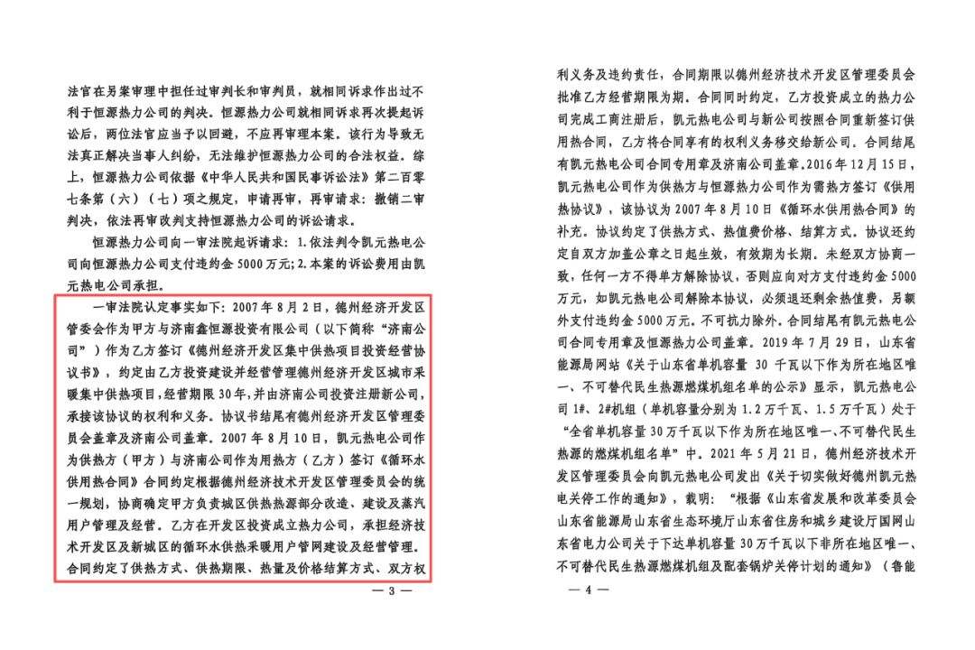 “我們已收到華夏金租商洽函兩年多時間,由于三方至今仍未達(dá)成供熱管網(wǎng)租賃協(xié)議,導(dǎo)致恒益熱力無償占據(jù)凱元熱電供熱管網(wǎng)四年分文未支付費用?!瘪T承強(qiáng)表示,為此,凱元熱電最近將恒益熱力訴至法院,目前德州經(jīng)濟(jì)技術(shù)開發(fā)區(qū)人民法院已受理此案。但官方通過當(dāng)?shù)孛襟w解釋,凱元熱電關(guān)停工作專班與華夏金租多次磋商,正在積極細(xì)化具體方案,有序推進(jìn)實施。