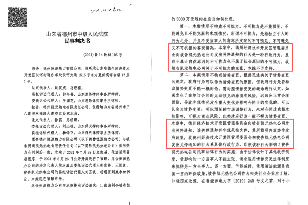 而德州經(jīng)開區(qū)管委會之前作出“關(guān)停通知”的依據(jù)是國家和省里的政策要求。但有意思的是,德州市中級人民法院卻在隨后的凱元熱電一起民事訴訟案中認(rèn)定此“關(guān)停通知”不構(gòu)成不可抗力,屬于當(dāng)?shù)卣姓袨?。這意味著此次關(guān)停不屬于政策性關(guān)停。