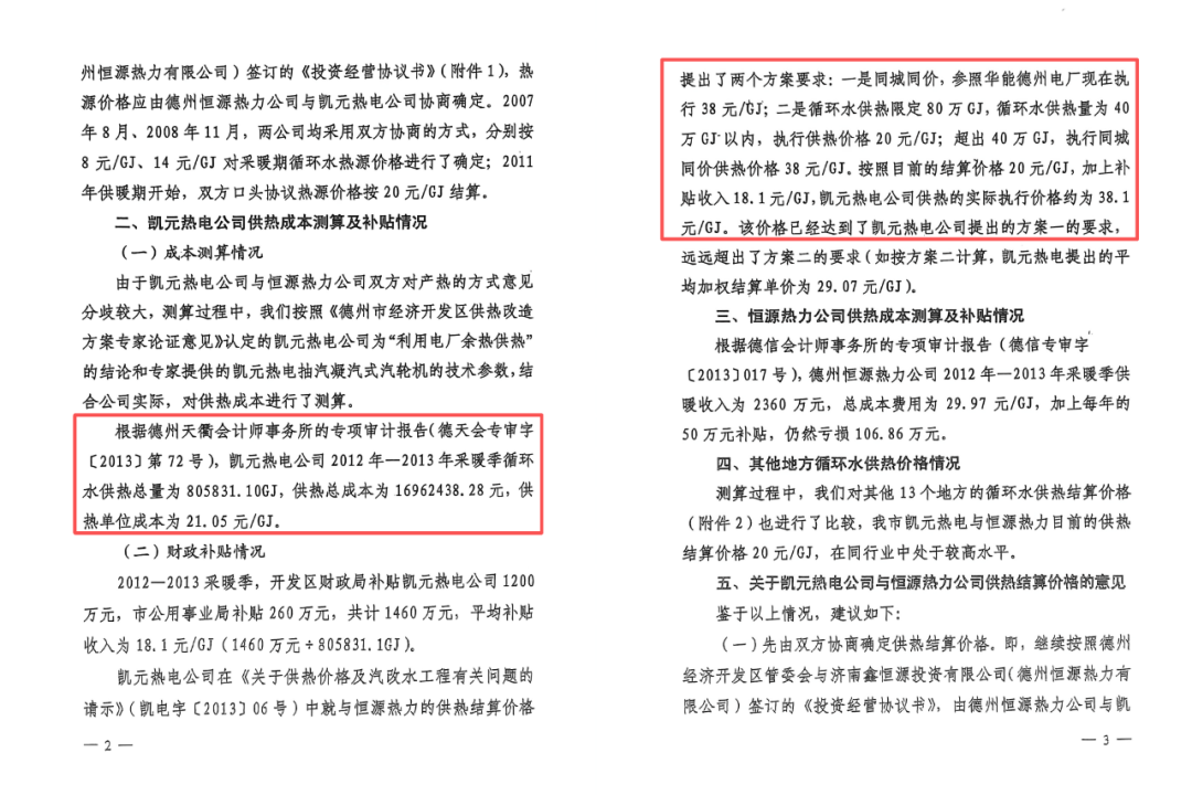 為落實市委書記的批示要求,德州市發(fā)改委迅速做出了《關(guān)于協(xié)調(diào)解決凱元熱電有關(guān)問題的匯報》,報告認(rèn)為“凱元熱電與恒源熱力雙方供熱結(jié)算價現(xiàn)仍為20元/吉焦,遠(yuǎn)低于市場價。2010年、2012年兩次向市物價部門申請調(diào)價,因雙方對測算結(jié)果未達(dá)成一致,至今未落實。建議按同城同價原則,參照華能電廠與市熱力公司的結(jié)算價格,確定38元/吉焦為雙方的結(jié)算價格,由市政府批準(zhǔn)后執(zhí)行”。